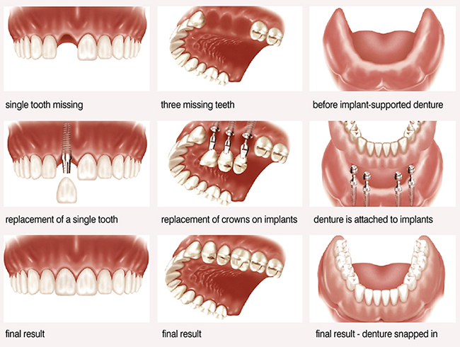 A dental implant is a small, sturdy titanium post that is carefully placed in the jawbone. It can be placed in either the upper or lower jaw, and once healed, the titanium tooth implant functions much like a natural tooth root. After the dental implant has fused with the bone and is supported by the surrounding tissues, a replacement tooth or crown may be placed on top of the titanium tooth implant. A fixed bridge or removable denture can also be anchored by a dental implant to provide stability and comfort.